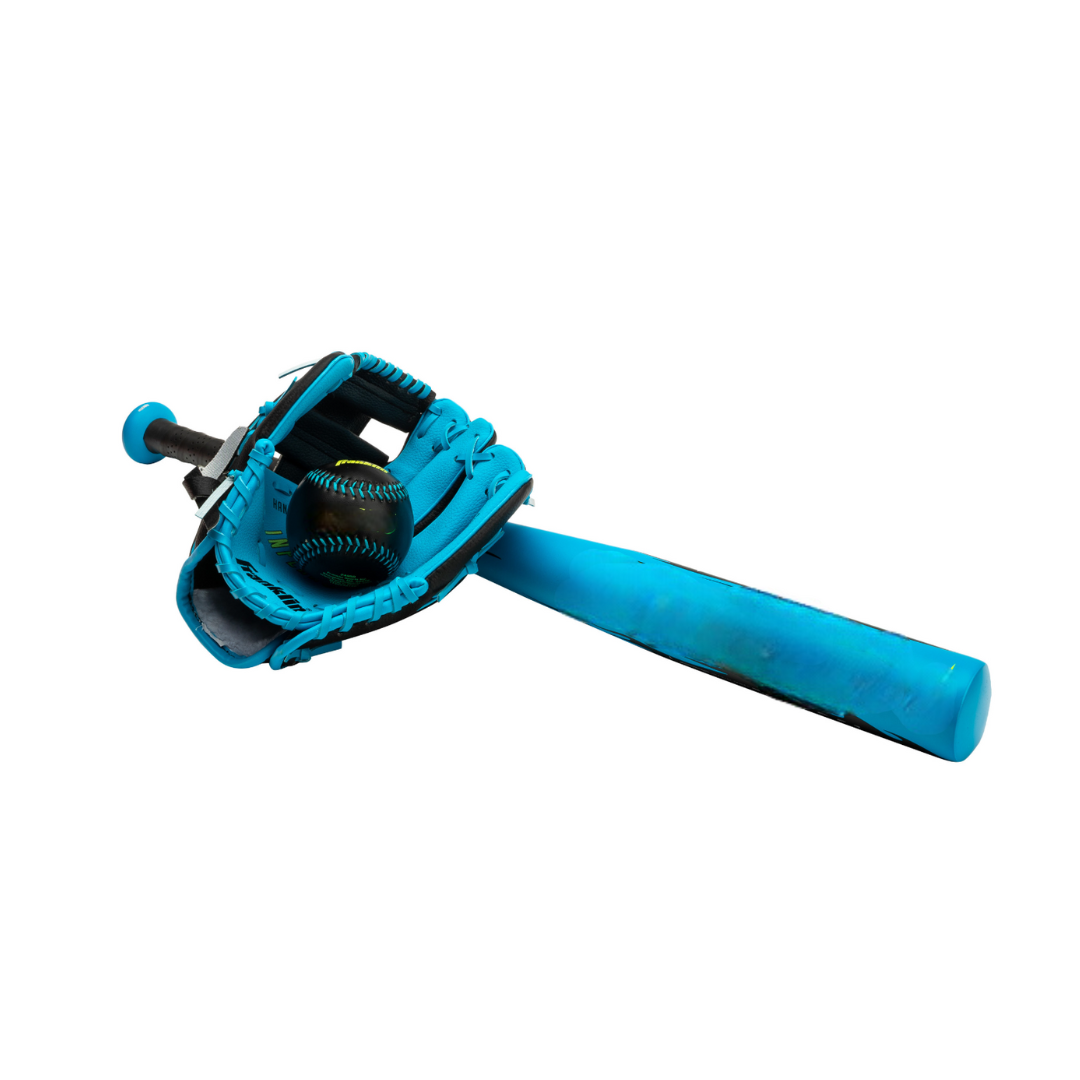 The Franklin Sports Blue Inferno Tee Ball Set provides everything a young player needs to get started in baseball or tee ball. This set includes a 25″ aluminum bat, a 9″ PVC glove, and a tee ball, making it perfect for children just starting their sports journey. - Lightweight Aluminum Bat with Drop 10 Design